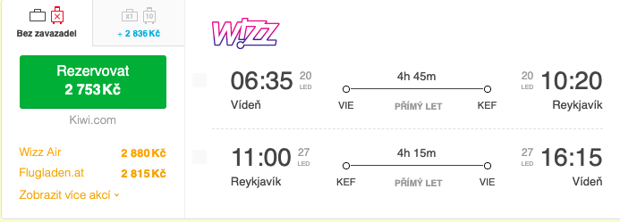 Z vídeňského letiště společnost WizzAir provozuje přímé lety dvakrát týdně na letiště v Reykjavíku. Zpáteční letenku jde pořídit již od 2 753 Kč včetně malého zavazadla.