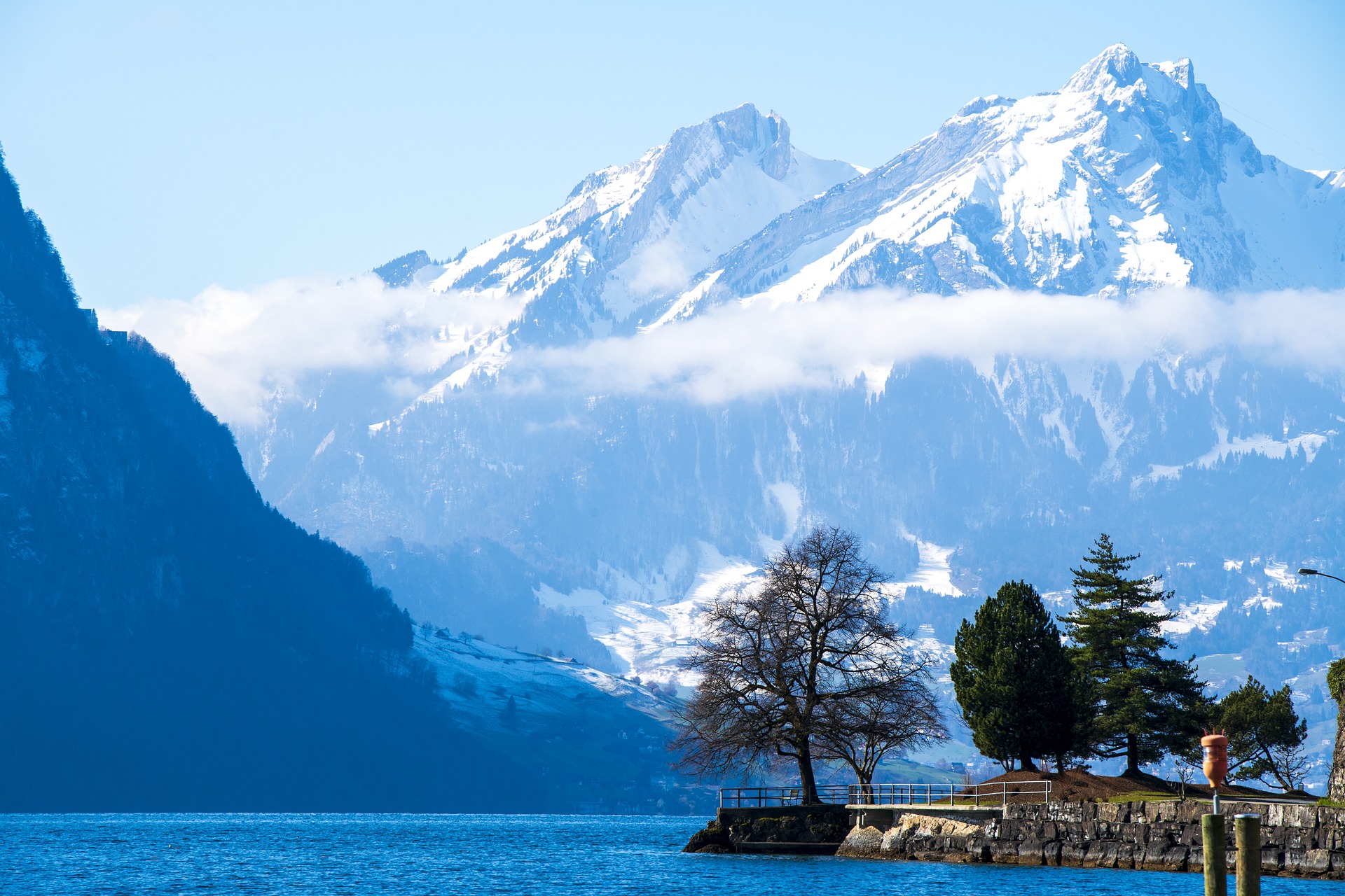 Pohled shora na staré město s opevněním a věžemi ve městě Lucern ve Švýcarsku