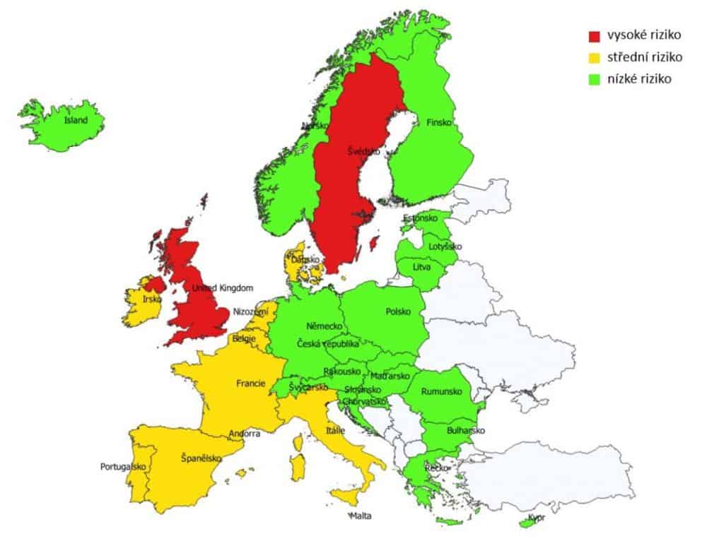 V červené zóně jsou aktuálně ze všech evropských států pouze Velká Británie a Švédsko. Při návratu z těchto států musí mít negativní test také Češi.