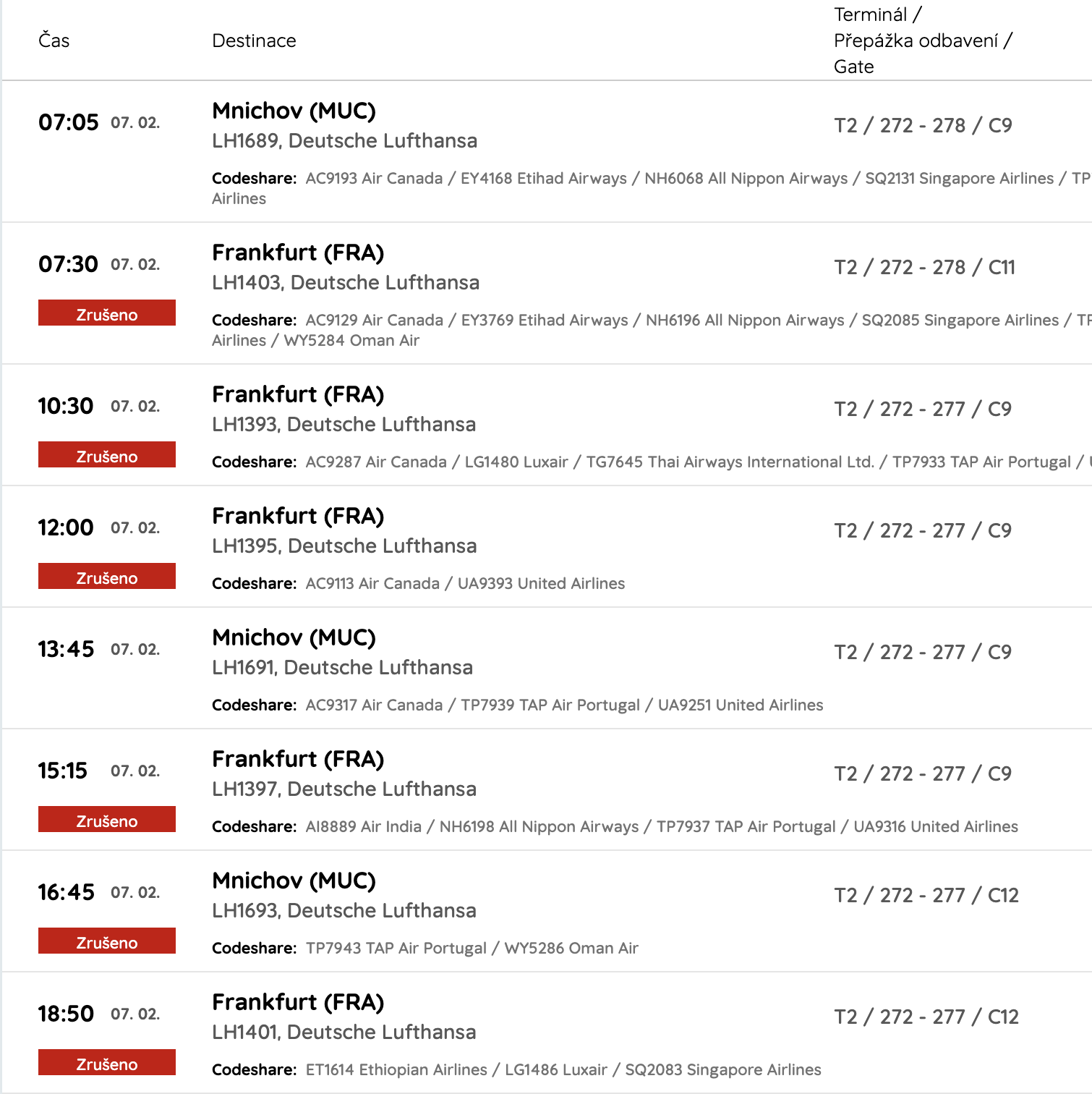 Na čtvrtek 8. února zatím letecká společnost žádné další lety nezrušila.