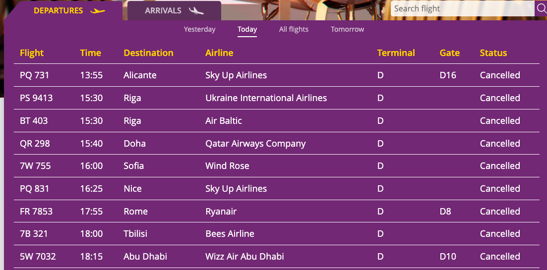 Všechny lety na Ukrajinu jsou zrušeny a vstup do leteckého prostoru Ukrajiny je komerčním letounům zakázán.