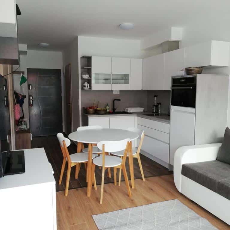 Čeká vás ubytování v prostorném dvoupokojovém apartmánu s celkovou rozlohou 40 m². Dorůžova se vyspíte na manželských postelích královských rozměrů, v obývacím prostoru se nachází také gauč, který v případě potřeby může posloužit coby přistýlka. V apartmánu nechybí TV s plochou obrazovkou a WiFi připojení.
