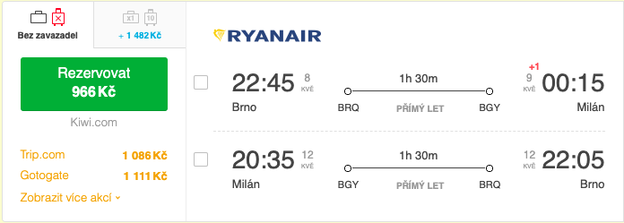 Z brněnského letiště létá do Milána (Bergamo) dvakrát týdně v pátek a pondělí společnost Ryanair. Zpáteční letenky pořídíte za několik stovek včetně malého zavazadla.