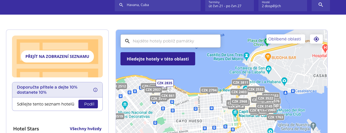 Vzhledem k průběžným restrikcím může být nabídka ubytování např. na Booking.com omezena. Hotelová nabídka ubytování po zadání čísla mobilního telefonu, nebo Facebook Messenger na Snaptravel. Stránka je po přihlášení plně v češtině a platba je v CZK.