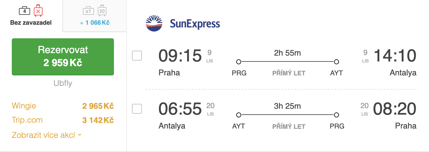 Antalya je oblíbenou turistickou destinací, kam se můžete vydat z Prahy s leteckou společností SunExpress. Pokud plánujete dovolenou v listopadu, můžete využít výhodných cen letenek. Například zpáteční let z Prahy do Antalye v termínu od 9. listopadu do 20. listopadu 2024 vás vyjde na přibližně 2959 Kč včetně malého kabinového zavazadla.