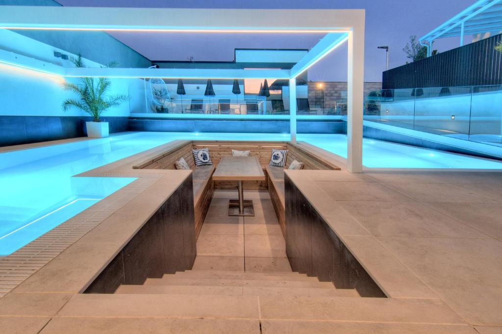 Exotika na Moravě s palmami, bazénem a třeba houpací sítí. Posezení se nabízí přímo uprostřed venkovního bazénu, který večer září různými barvami.